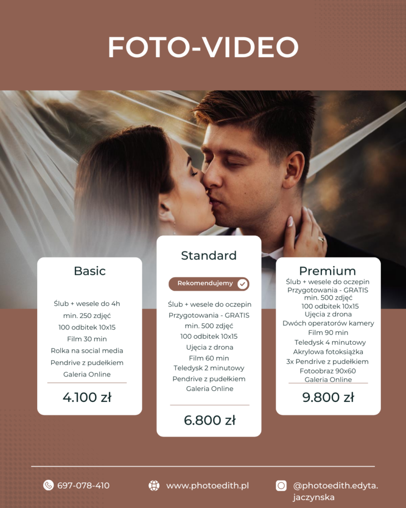 Nasze pakiety Foto-Video są idealnym rozwiązaniem dla par szukających kompleksowej obsługi fotograficznej i filmowej w jednym. W ramach współpracy oferujemy 3 pakiety.